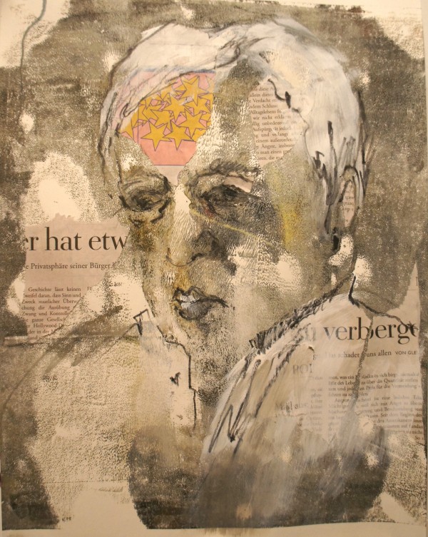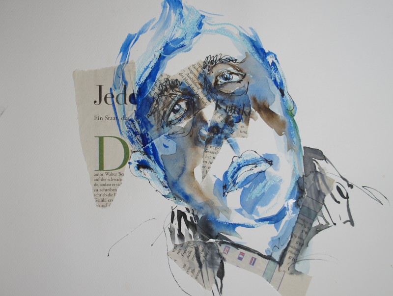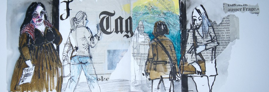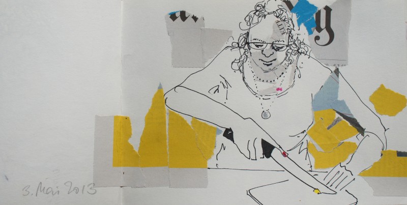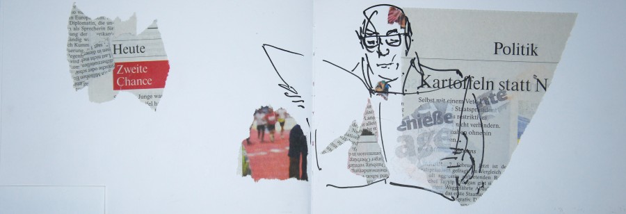 In den neuen Collage-Zeichnungen reizt mich vor allem die Verbindung des materiellen Charakters mit dem Inhalt. Wie ich auch sonst mit der Tusche oder dem Graphitstift arbeite, kombiniere ich das Collagematerial und den Zeichenstift während des Arbeitens abwechselnd. So wird auf die Zeichnung raufgeklebt, weiter gezeichnet, der Schnipsel wiederum gerissen, überklebt, überzeichnet oder übermalt. Dabei reduziere ich das Collagematerial nicht auf eine illustrative Funktion, sondern nutze die jeweilige Form, Farbe, Oberflächenstruktur und auch die darauf abgebildeten Buchstaben als gestalterisches Mittel. Am Ende ist es manchmal überraschend, was sich aus dieser Kombination inhaltlich weiterentwickelt.
