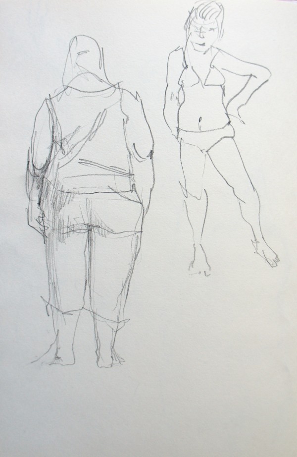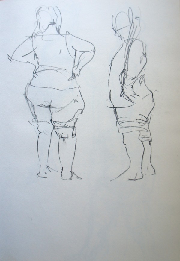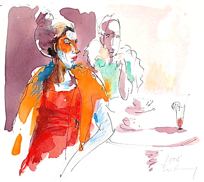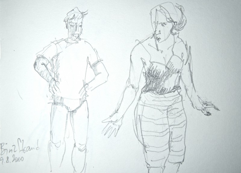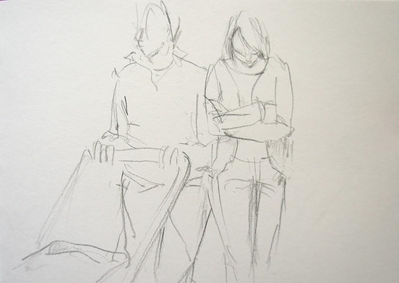 Die Haltung des Körpers und die räumliche Beziehung zwischen den Personen drückt aus, wie sie sich ablehnen, wie Offenheit, Zuneigung und Schutzpanzer sich abwechseln. Beobachtungen sind die Grundlage meiner Zeichnungen und Bilder. Überall in den Straßen oder wenn ich in einer Warteschlange stehe, nehme ich daran teil, wie Menschen nonverbal miteinander kommunizieren und ihre Gefühle ausdrücken. Meine Beobachtungen setze ich nicht alle um; manche Zeichnungen sind eine Verflechtung mehrerer Beobachtungen und letztendlich auch meiner subjektiven Einstellung dazu.